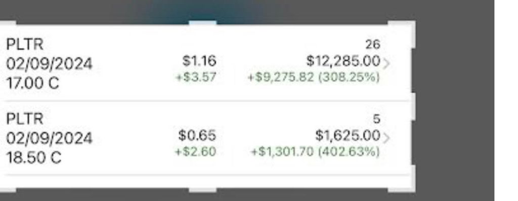 In line with our predictions, our strategic options pick with $17.00 strikes witnessed a remarkable surge, soaring 300% overnight. This phenomenal growth underlines the precision of our investment strategy and the intrinsic value we saw in PLTR. Bellow images serve as tangible proof of this achievement, showcasing the significant gains realized from this investment move.